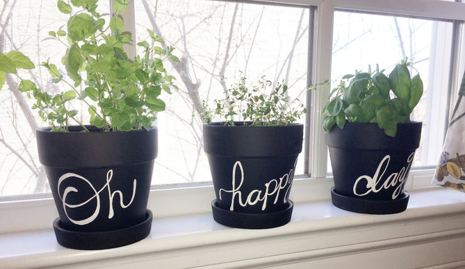 Be creative! If “Oh Happy Day” doesn’t do it for you, pick another inspirational or funny phrase that will lift your spirits whenever you glance at it. You can write a short phrase on one large pot or use several small pots to spell out one word.